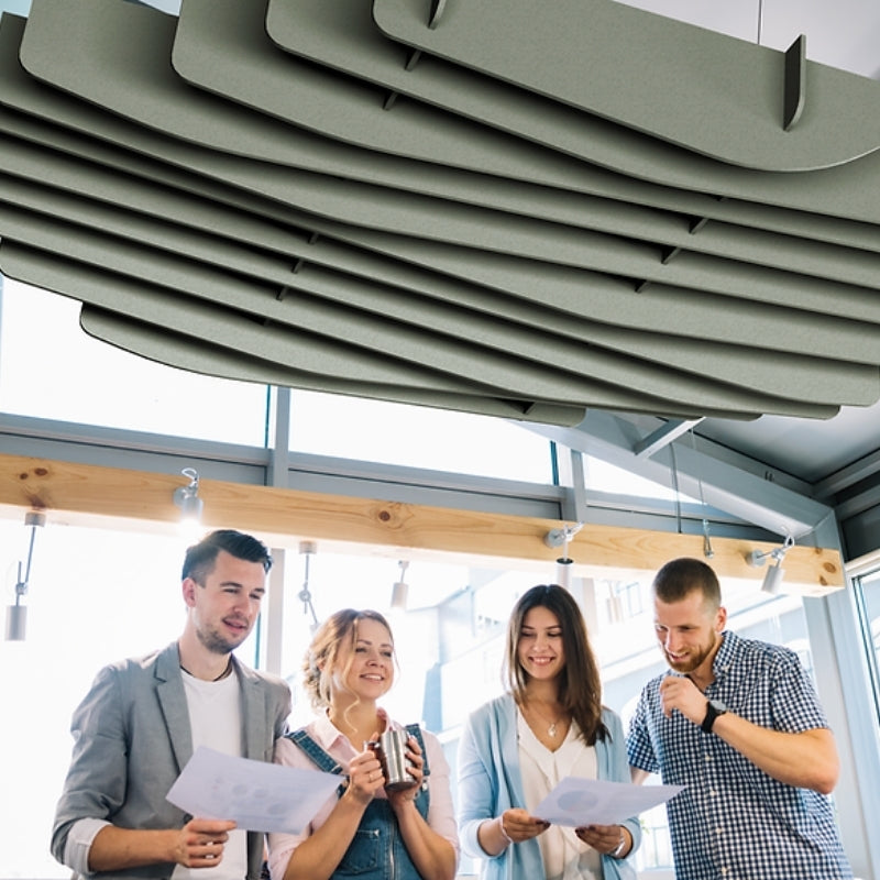The Orb acoustic ceiling raft from Lumii's StratoScape series offers a blend of striking aesthetics and excellent sound absorption. Designed from sustainable mixfelt material, made with 75% recycled plastic bottles, keeping it environmentally friendly.