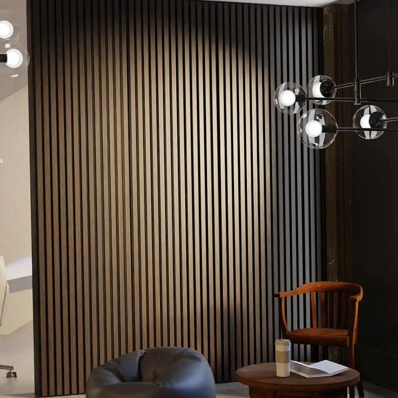 La base de nos panneaux à lattes en bois de 2400 (mm) est constituée d'un feutre noir de 8 (mm) d'épaisseur, tandis que la base de nos panneaux à lattes en bois de 2700 (mm) est constituée d'un feutre noir de 7 (mm) d'épaisseur fabriqué à partir de 40 % de bouteilles en plastique recyclées. Le matériau est certifié conforme aux exigences des normes de recyclage mondiales, il ne contient pas de produits chimiques ou de substances nocives pour la santé telles que le formaldéhyde ou le pentachlorophénol.